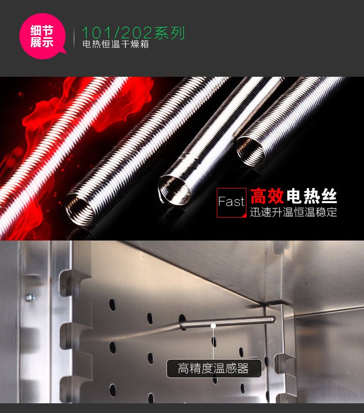 产品介绍 使用推荐: 适合工矿企业、基础实验室和车间常规测试,不建议长时间不间断使用。对温度均匀性要求较高和含水量较大的样品不建议使用。较贵重的样品建议务必加装独立限温控制器。 警告!易燃易爆易挥发物品严禁放入箱内加热干燥,对于高价值的物料进行加热,**加装独立限温器,设定最高温度上限,双重保险确保物料不会因箱体电子元件失效而升温过高导致损坏。 适用范围: 供工矿企业、化验室科研单位等作干燥、烘焙、热处理、加温,但不适用于挥发性、易燃、易爆等物品,以免引起爆炸。 结构特点: 1、温控器分指针式、微电脑智能PID数字显示两种; 2、外壳采用金属漆喷制,整体设计美观大方; 3、工作室内搁板高度、搁板数量均可调节,方便存取不同规格样品; 4、箱门安装有双层钢化玻璃观察窗、能清晰地观察到箱内物品。 产品规格: